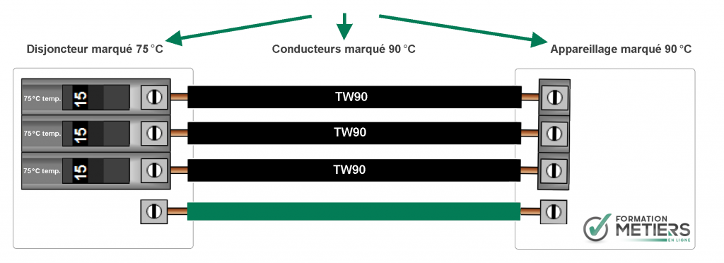 Par exemple, si un conducteur possède un isolant marqué à 90 degrés Celsius et qu’il est raccordé, d’un côté comme de l’autre, à un appareil ou un disjoncteur sur lequel on indique clairement que la température aux terminaisons doit être d’au plus 75 degrés Celsius, on doit simplement considérer ce conducteur comme si son isolant était marqué d’une température maximale de 75 degrés Celsius.
