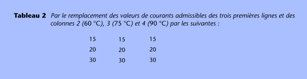 Les valeurs des courants admissibles aux tableaux 1, 2, 3 et 4 du Code de construction du Québec, Chapitre V – Électricité 2018, ne représentent plus les valeurs nominales maintenant applicables au Québec. Voici par exemple le tableau 2, édition 2018 :